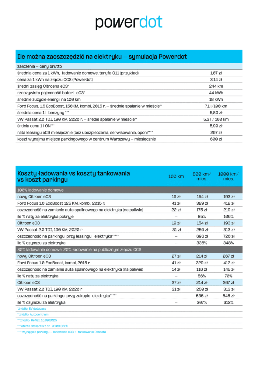 Przejechanie 100 km najpopularniejszym obecnie w Polsce elektrykiem, Citroenem eC3, kosztuje średnio 19 zł w przypadku ładowania domowego oraz średnio 27 zł w przypadku miksu energii pochodzącej z gniazdka w domu oraz z szybkich stacji publicznych – wynika z szacunków Powerdot.