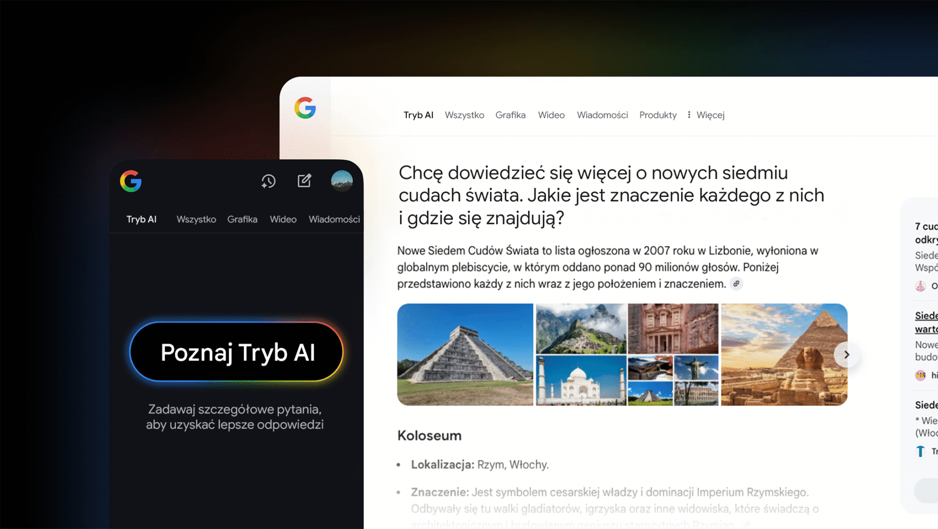 Google spina rozumowanie Gemini 2.5 z bieżącą wiedzą Search (Knowledge Graph, dane o świecie, miliardy produktów), żeby odpowiadać na trudniejsze, dłuższe, często multimodalne pytania – i równocześnie lepiej dowozić ruch do różnorodnych źródeł w sieci. Dla firm oznacza to przygotowanie contentu i feed „pod odkrywanie”, a dla użytkowników – mniej wyszukiwań cząstkowych, więcej „od razu na temat” z możliwością dopytywania i pogłębiania.