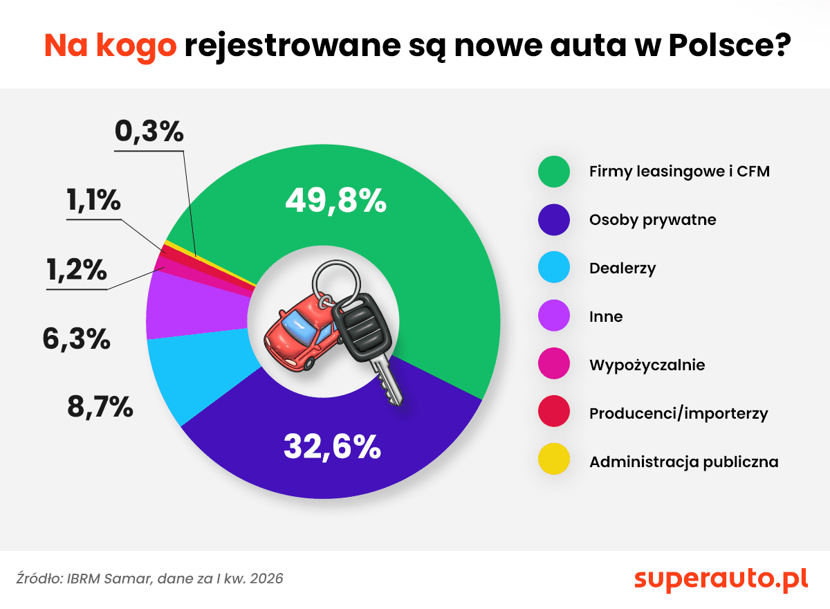 Kto najbardziej skorzysta na elektronicznej rejestracji pojazdu? Według danych IBRM Samar, niemal co drugie nowe auto w Polsce rejestrowane jest na firmy leasingowe oraz CFM (wynajem długoterminowy), a co trzecie – na osoby prywatne, w tym przedsiębiorców. Spory, bo 9-proc. udział mają też dilerzy.