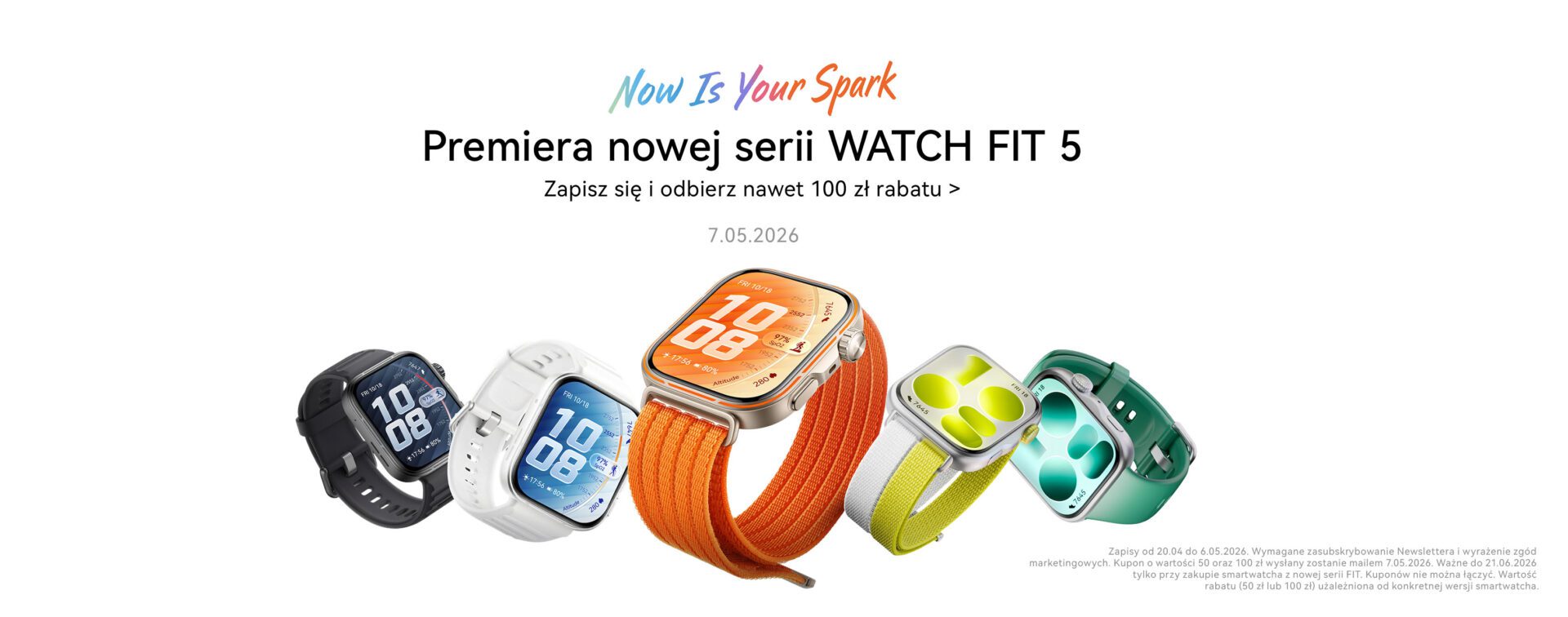 HUAWEI WATCH FIT 5 oferuje do 10 dni pracy na baterii oraz szeroką gamę trybów sportowych, wspierając utrzymanie dobrej kondycji i samopoczucia. Wytrzymałe szkło ceramiczne i koperta z aluminium klasy lotniczej sprawiają, że zegarek jest lekki i kompaktowy (waży zaledwie 27 gramów przy 9,5 mm grubości), a jednocześnie odporny na codzienne wyzwania. Duży ekran AMOLED o przekątnej 1,82 cala i jasności do 2 500 nitów zapewnia wysoką czytelność ekranu w słoneczne dni. Funkcja Curve Pay umożliwia szybkie płatności zbliżeniowe bez użycia karty czy telefonu. Zegarek dostępny będzie w wariancie z nieuczulającym paskiem z fluoroelastomeru w kolorach czarnym, białym (w zestawie z dodatkowym różowym), zielonym oraz fioletowym. Wersja z tkanym, srebrno-zielonym paskiem w zestawie z dodatkowym trójkolorowym w prezencie dostępna będzie wyłącznie na huawei.pl.